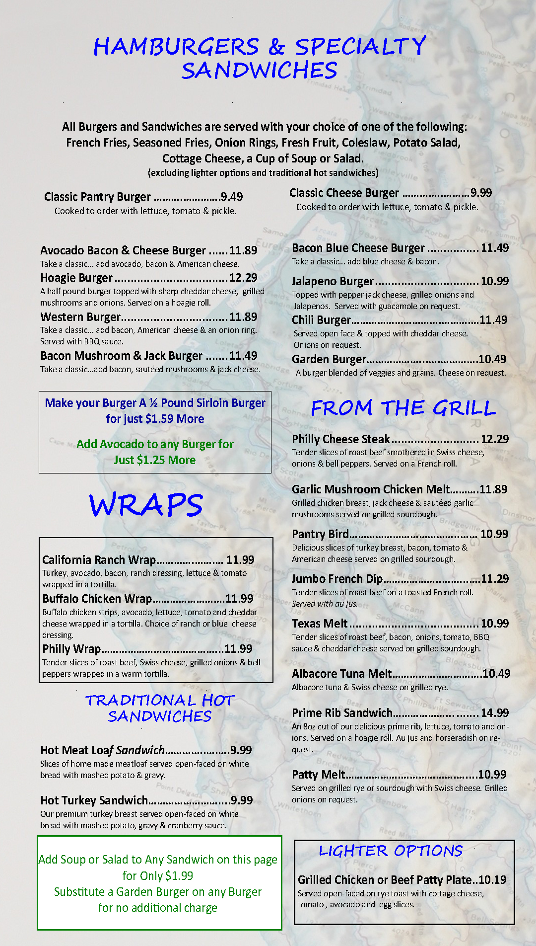 For Lunch, choose from Hamburgers, Sandwiches, Soups, and Salads.