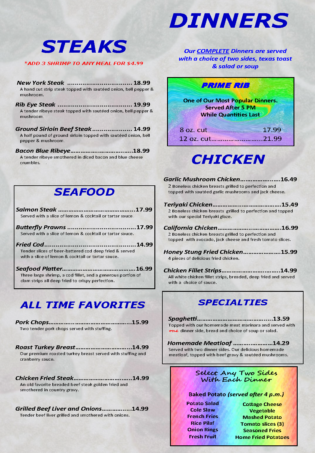 Dinner offerings include Steaks, Seafood, Chicken, and Prime Rib. Finish things of with one of the Village Pantry's legendary Homemade Pies!