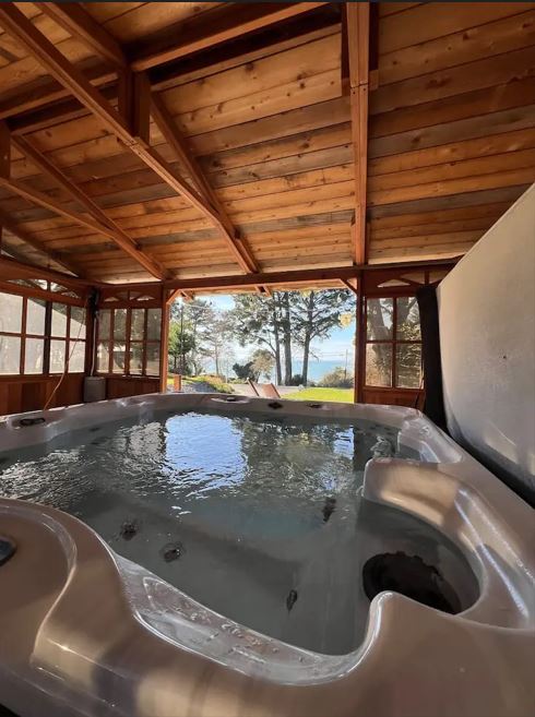 Hot tub with ocean view on the grounds.